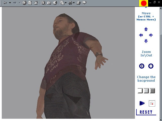 Early in the year 2000, Andy Roberts, Frank and Evan went along to the Millennium Dome at Greenwich, London and while we were in there, we each had ourselves turned into Avatars at the BT TalkZone. It's one of the best things you can do at the Dome, because you have something to bring home with you afterwards- a three dimensional computer animation based on your own photograph from 4 different angles, that can be viewed, rotated, and one day included in computer games, MUDs and graphical chat rooms - or so they say.