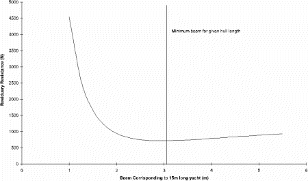 As can be seen from the figure once you go below a beam of around 3.1m for a length of 15m the resistance curve increases considerably which would give values which are obviously incorrect. The only other way to continue with this line of approach was to use a different series for the resistance calculation. After discussion it was found that Series 64 model resistance extrapolator would accept large beam to length ratios and might be applicable to slender hull forms. After obtaining a copy of the Series 64 it was found that the hull speed range for the series was too high at around 30-37 knots, and also it was not designed for use with yacht hulls.