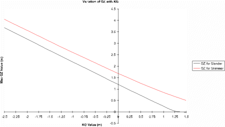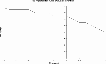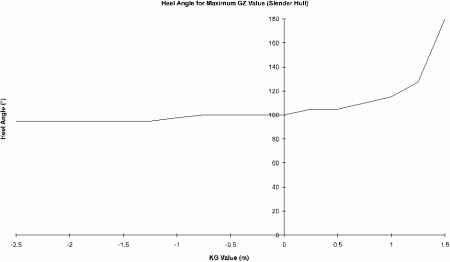 3.3 STABILITY TESTS Before running the two models through the V.P.P the variation of the GZ curve for the two hull forms had been investigated by varying the KG value from -2.5m to 1.5m with 0.25m steps. GZ curves were plotted for each step and the maximum value of GZ for each KG value was plotted on the same graph for both hulls. The resulting graph can be seen in Figure 3.4. As can be see the graph is as expected although the slender hulls GZ value does go negative when the KG is high at 1.5 m. On examining the GZ curves for various values of KG you start to see a major difference in the graphs. The first difference is that for KG values of between -2.5m and 0.75m the slender hull has a vanishing angle of 180°. The skimmer dish hull form on the other hand has a vanishing angle of 180° when the KG is in the range of -2.5m to -1m. The next major difference is when you look at the shape of the graphs. In the case of the slender hull, as the KG value rises the point of maximum GZ moves to higher angles of heel, while in the case of the skimmer dish the point of maximum GZ moves to lower angles which is what you would normally expect. The position of the maximum GZ value for the slender yacht could be the cause of the problem in the V.P.P runs. In high wind speeds where the slender hull form was found to loose performance to the skimmer dish the slender hull form would be heeling to a higher angle due to the lower GZ value. If you look at the graphs shown in Figure 3.5, the GZ curve for the skimmer dish rises reasonably quickly to its maximum value and then drops off, in the case of the slender hull the GZ curve rises slowly to it point of maximum value, which is at a higher value of heel than the skimmer dish’s maximum value. This means that the slender hull form will heel to a much greater angle before it can compensate for the heeling moment. Comparing the graphs shown in Figure 3.6 and Figure 3.7, the reason for the performance loss becomes apparent. As can be seen from the graphs the point of maximum restoring moment would occur at higher heel angles for the slender hull form than for the skimmer dish. Obviously in higher wind speeds since the slender yacht is heeling more the sails will be less efficient and this will account for the loss in performance. However the GZ and V.P.P tests do seem to indicate the need for a reduced heeling moment to reduce the heel angle if the performance is to be increased.