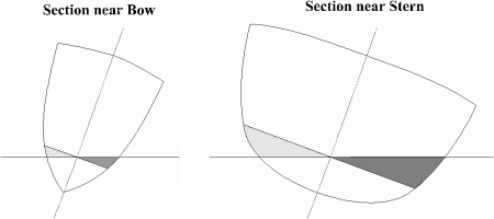 The straight forward pitch pole will not be covered as it has already been explained in section 2.1 and 2.2.2. Broaching however is generally only found in yachts with wide sterns and quite narrow bow sections, and length to beam ratios of below 1:3. The reason for this condition is shown in Figure 3.7. As can be seen the centre of buoyancy would be moved towards the stern when the yacht heels, this causes a change in longitudinal trim at the bow. The trim at the bow is also increased by influence from the sails as they are producing a pitching moment.
